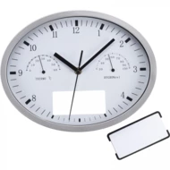 Owalny zegar ścienny z termometrem i higrometrem. Logotyp można umieścić na specjalnym panelu.