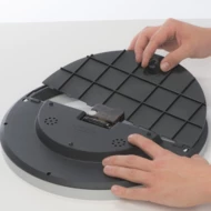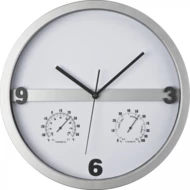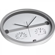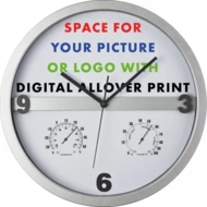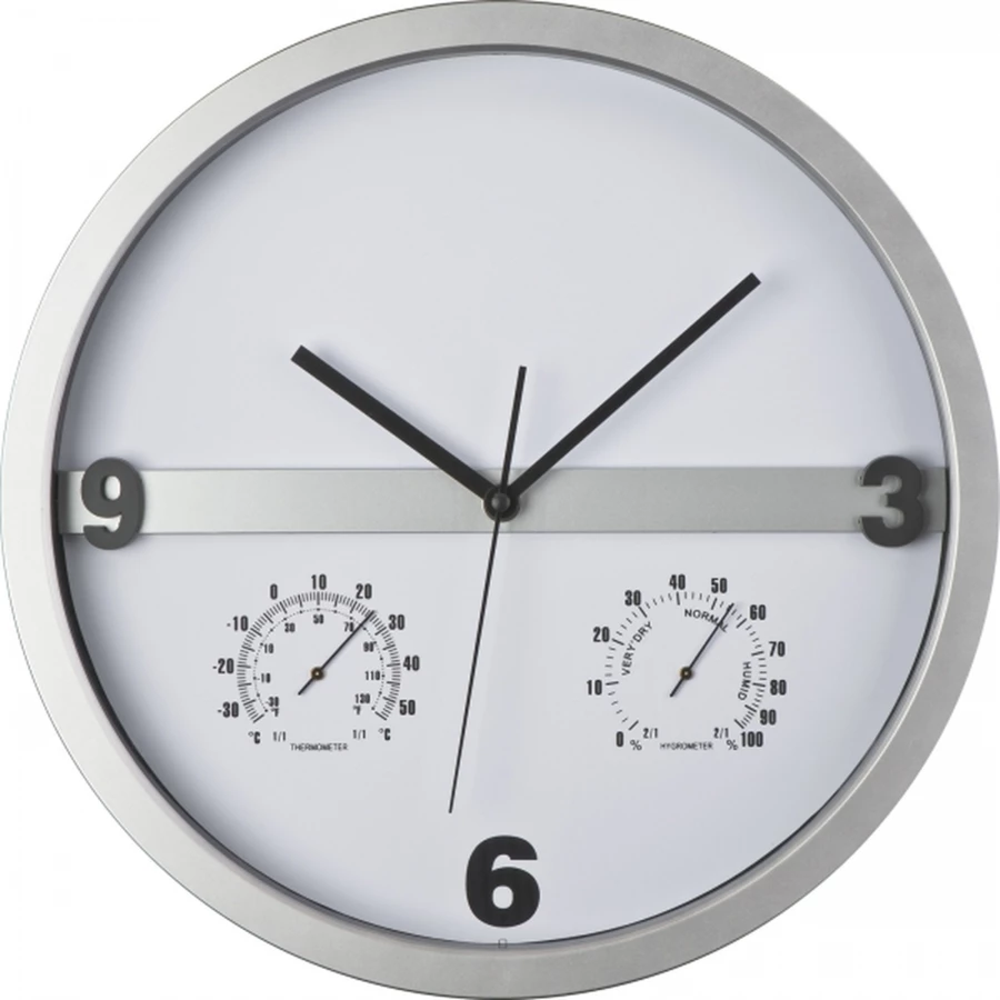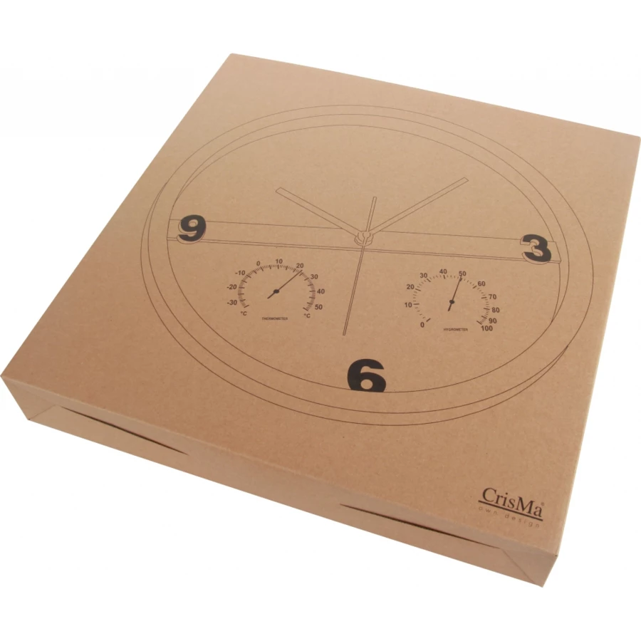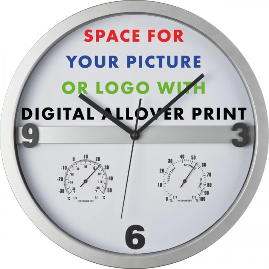 Minimalistyczny, designerski zegar. Wytrzymała obudowa. Dużo miejsca na nadruk na samej tarczy. Cichy mechanizm. Dodatkowy wskażnik temperatury i wilgotności powietrza. Brak baterii w zestawie.