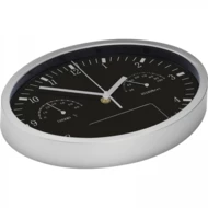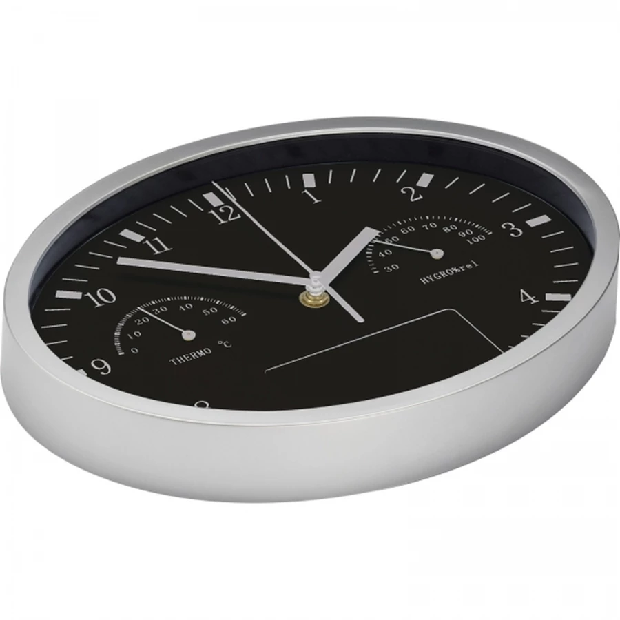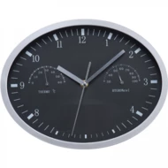 Owalny zegar ścienny z termometrem i higrometrem. Logotyp można umieścić na specjalnym panelu.