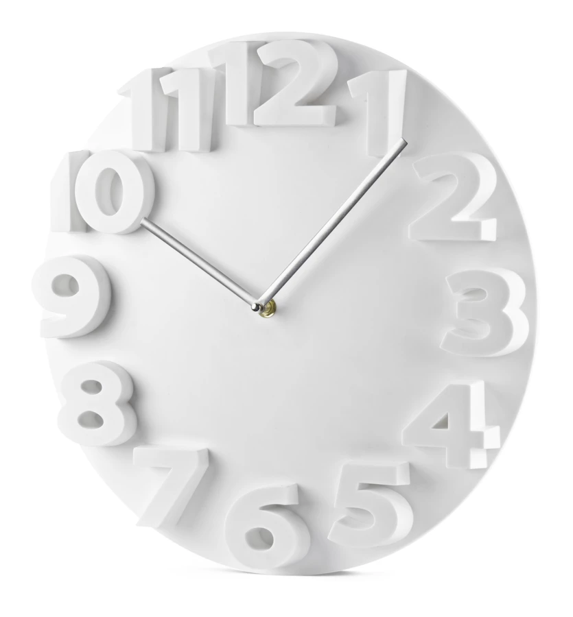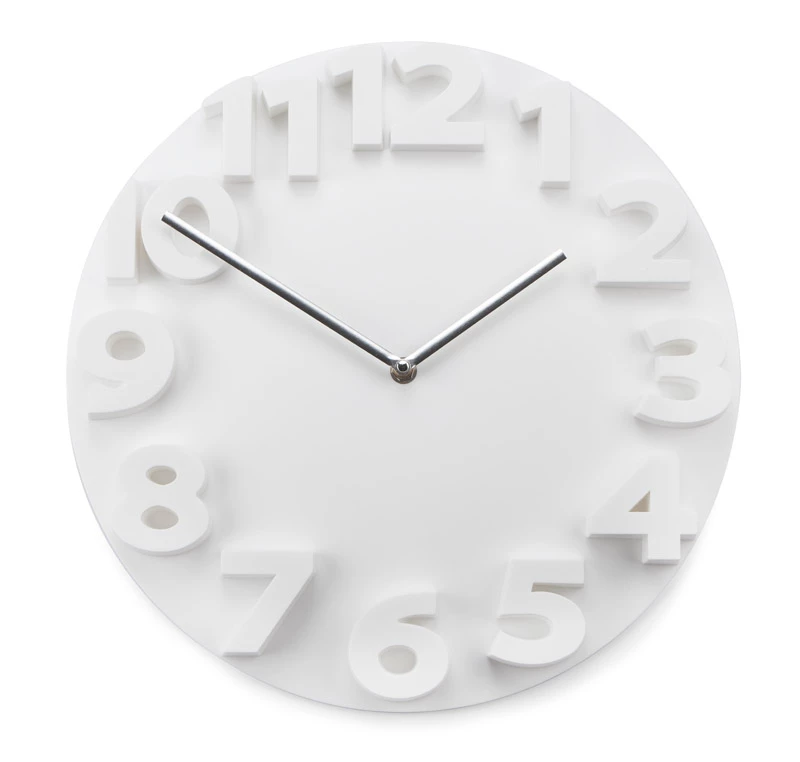 Duży zegar o nowoczesnym wyglądzie. Dzięki wypukłym cyfrom godzina jest bardzo dobrze widoczna.