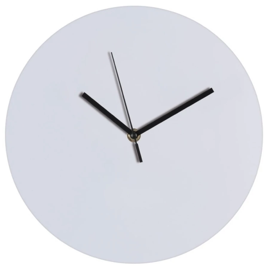 Okrągły zegar ścienny, wykonany z plastiku, z minimalistyczą tarczą. Biały zegar posiada czarne wskazówki.