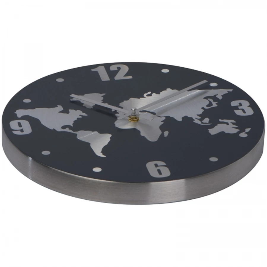 Zegar ścienny wykonany z aluminium z dekoracyjną mapą świata na tarczy.