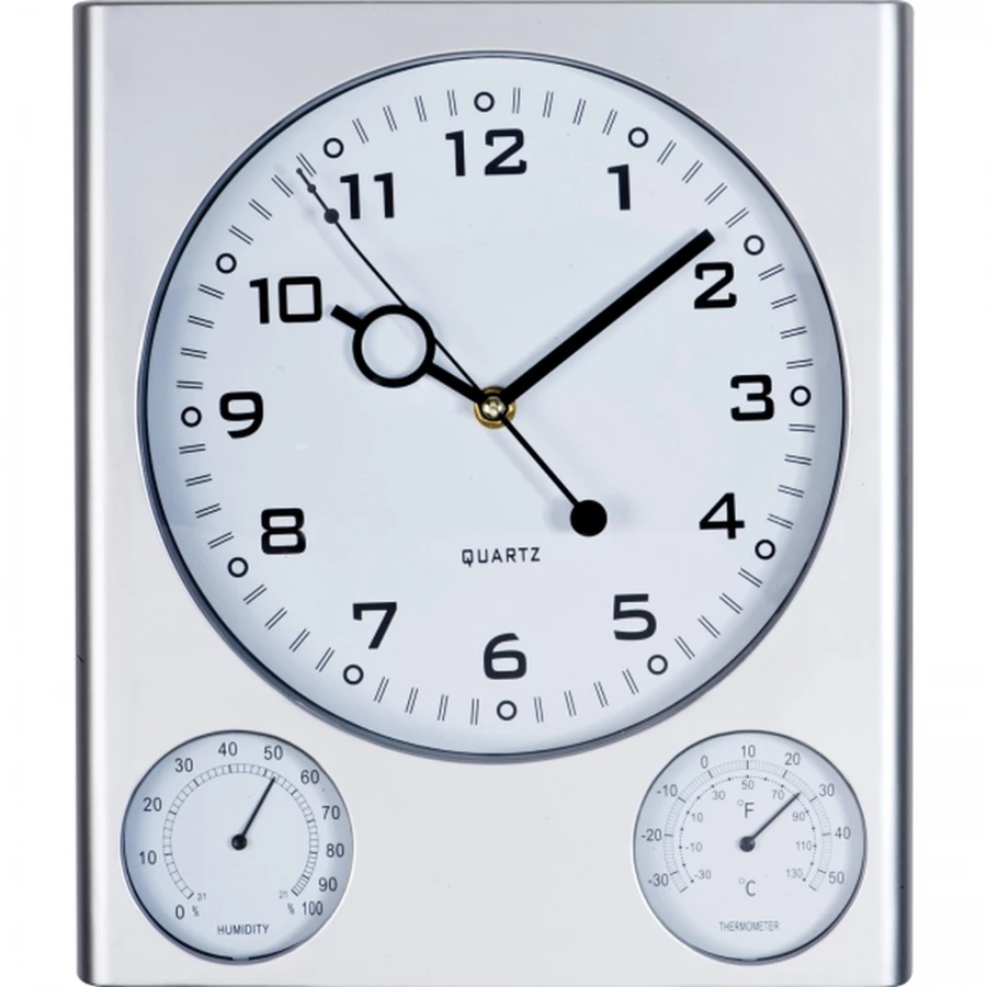 Zegar ścienny z higrometrem i termometrem, wykonany z plastiku i akrylu. Produkt nie zawiera baterii.