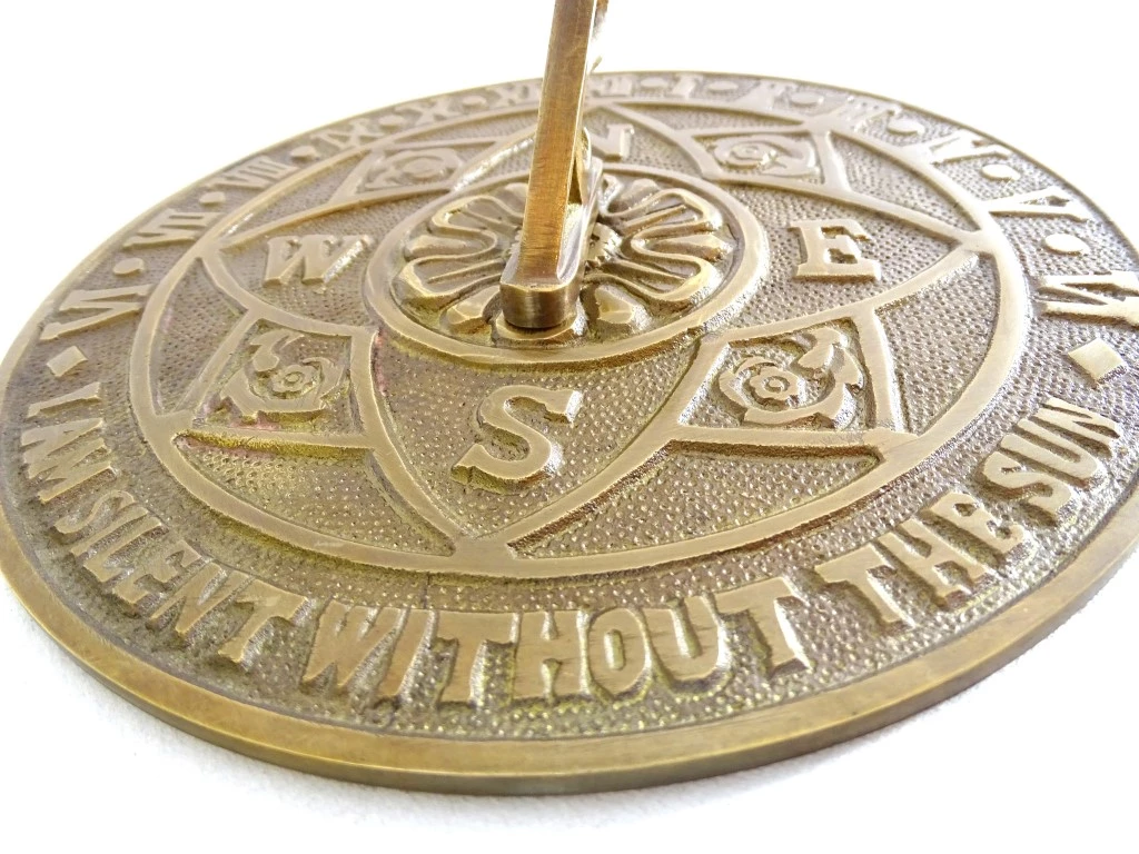 Ornamentyka kwiatowa, róża wiatrów i napis "I am silent without the sun" - Milczę bez słońca