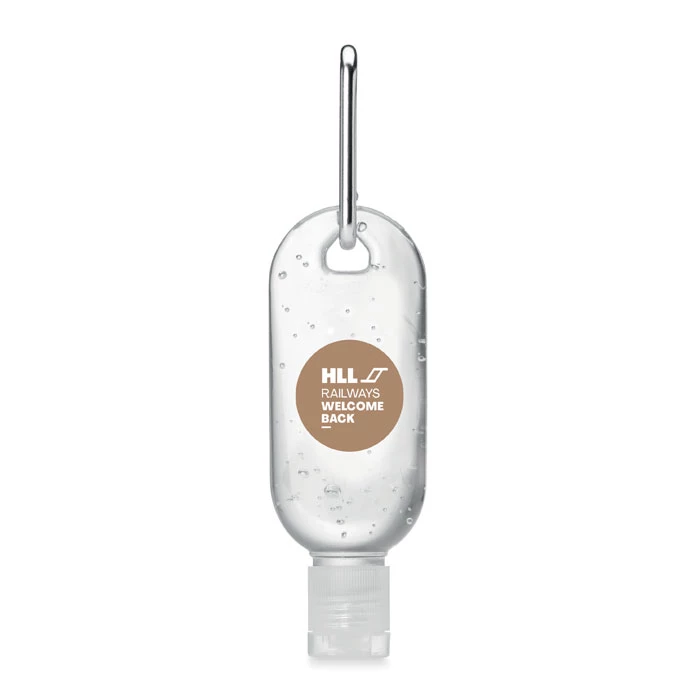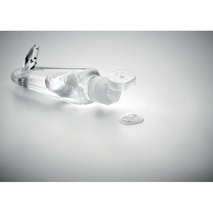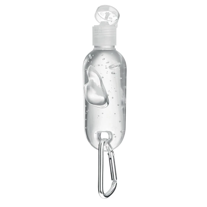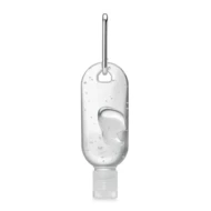 Żel do mycia rąk w butelce wielokrotnego użytku z PET z nakrętką z klapką i karabińczykiem. Pojemność 30 ml.