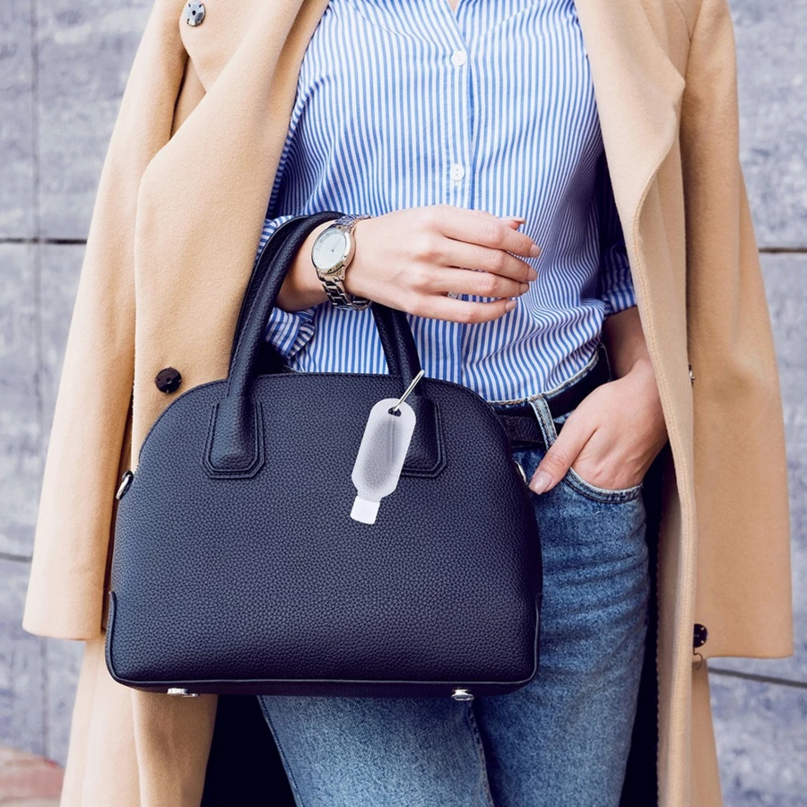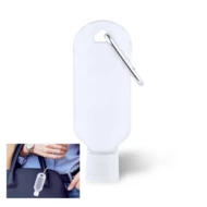 Żel do rąk w półprzezroczystej buteleczce (do wielokrotnego napełniania) z dozownikiem z zamknięciem i karabińczykiem, roztwór o 65% zawartości alkoholu, 30 ml
