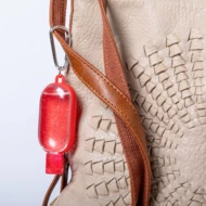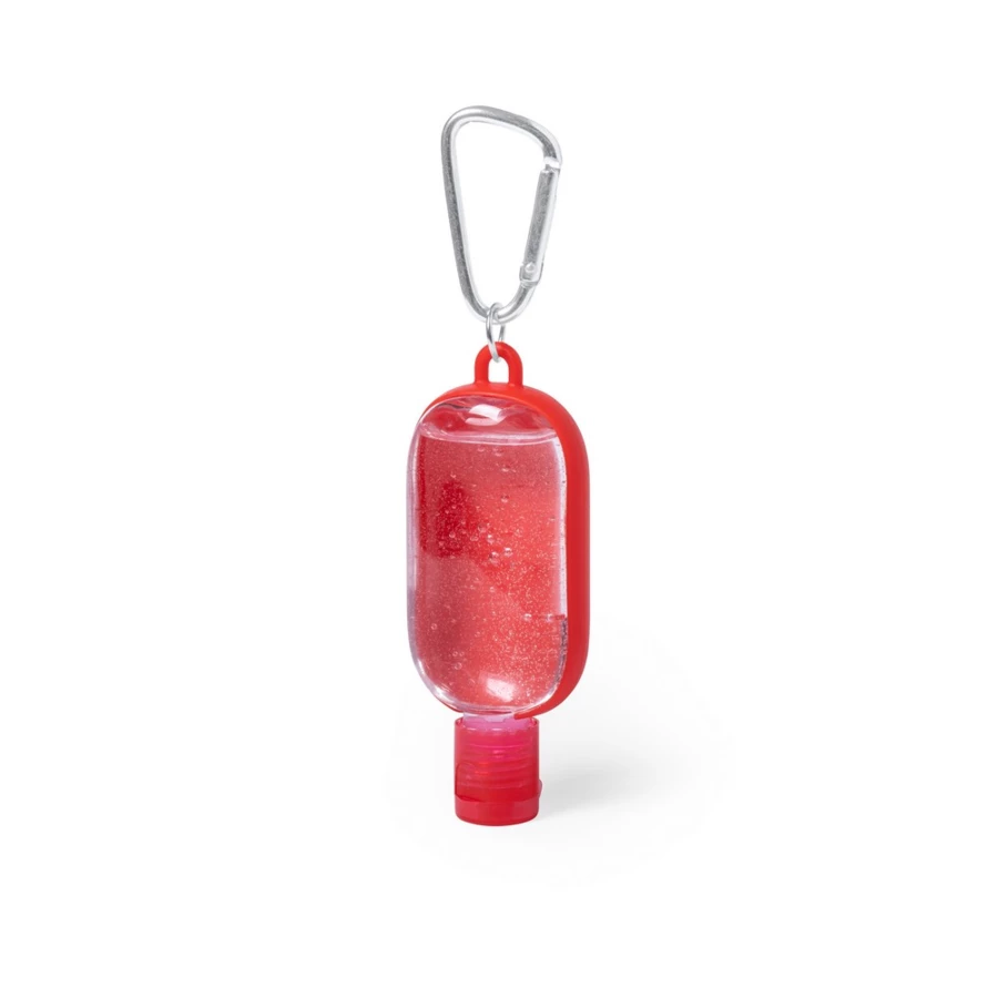 Żel do rąk w buteleczce (do wielokrotnego napełniania) z dozownikiem i karabińczykiem, zgodny z certyfikatem GMP (Good Manufacturing Practices), roztwór o 65% zawartości alkoholu, ekstrakt z aloesu, 30 ml