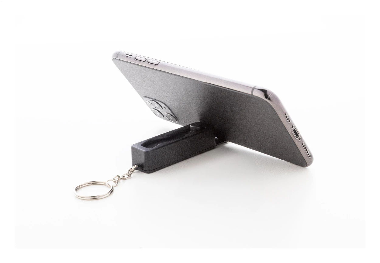 Brelok-zabawka antystresowa wykonana z recyklingowanego tworzywa ABS ze zintegrowanym uchwytem na telefon komórkowy i metalowym kółkiem.
