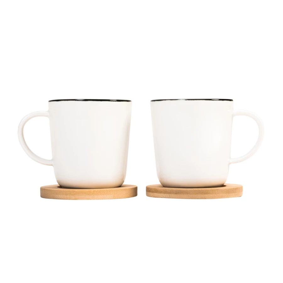 Zestaw składa się z dwóch kubeczków ceramicznych o pojemności 150 ml. Dodatkowo zawiera bambusowe podstawki, które nie tylko stanowią stylowy element dekoracyjny, ale także chronią powierzchnię.