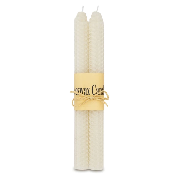 Zestaw 2 świec wykonanych ręcznie ze zwiniętych arkuszy woskowych. Zapakowany w tekturowe pudełko.