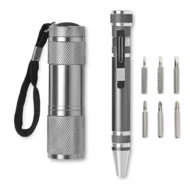 2 aluminiowe narzędzia w pudełku: latarka z 9 LED i multinarzędzie w kształcie długopisu z wkrętakami z nacięciem prostym (3 szt.) i gniazdem krzyżowym Phillips (3 szt.). 3 baterie AAA nie dołączone.