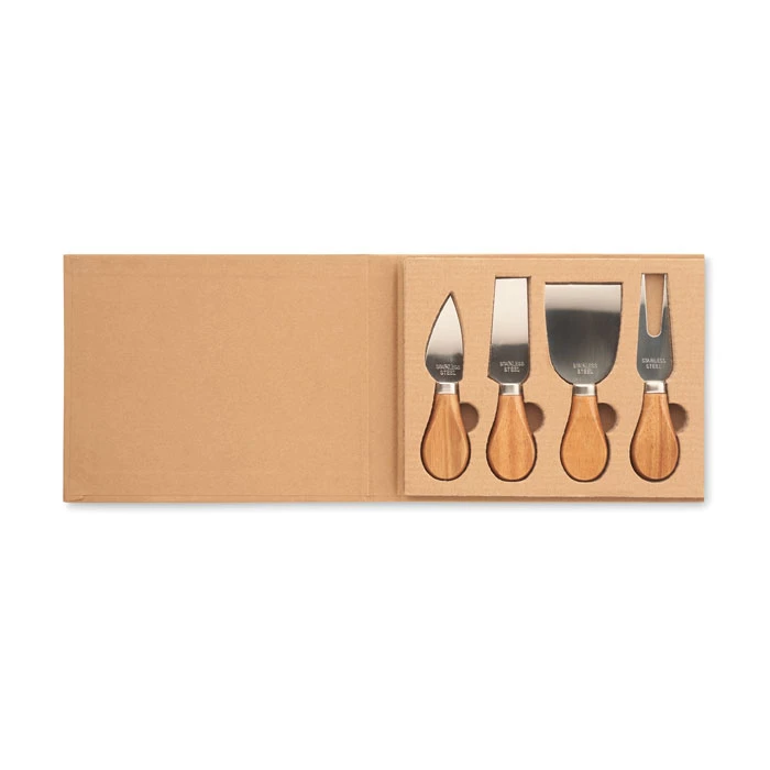 Zestaw 4 noży do sera ze stali nierdzewnej i uchwytami z drewna kauczukowego. Prezentowany w pudełku upominkowym z falistej tektury. Drewno jest produktem naturalnym, dlatego mogą występować niewielkie różnice w kolorze i rozmiarze poszczególnych elementów, co może mieć wpływ na ostateczny efekt zdobienia.