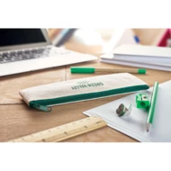 6 elementowy zestaw, zawierający piórnik z juty i bawełny, bambusową linijkę, drewnianą temperówkę, gumkę, ołówek i długopis z tektury z niebieskim tuszem.