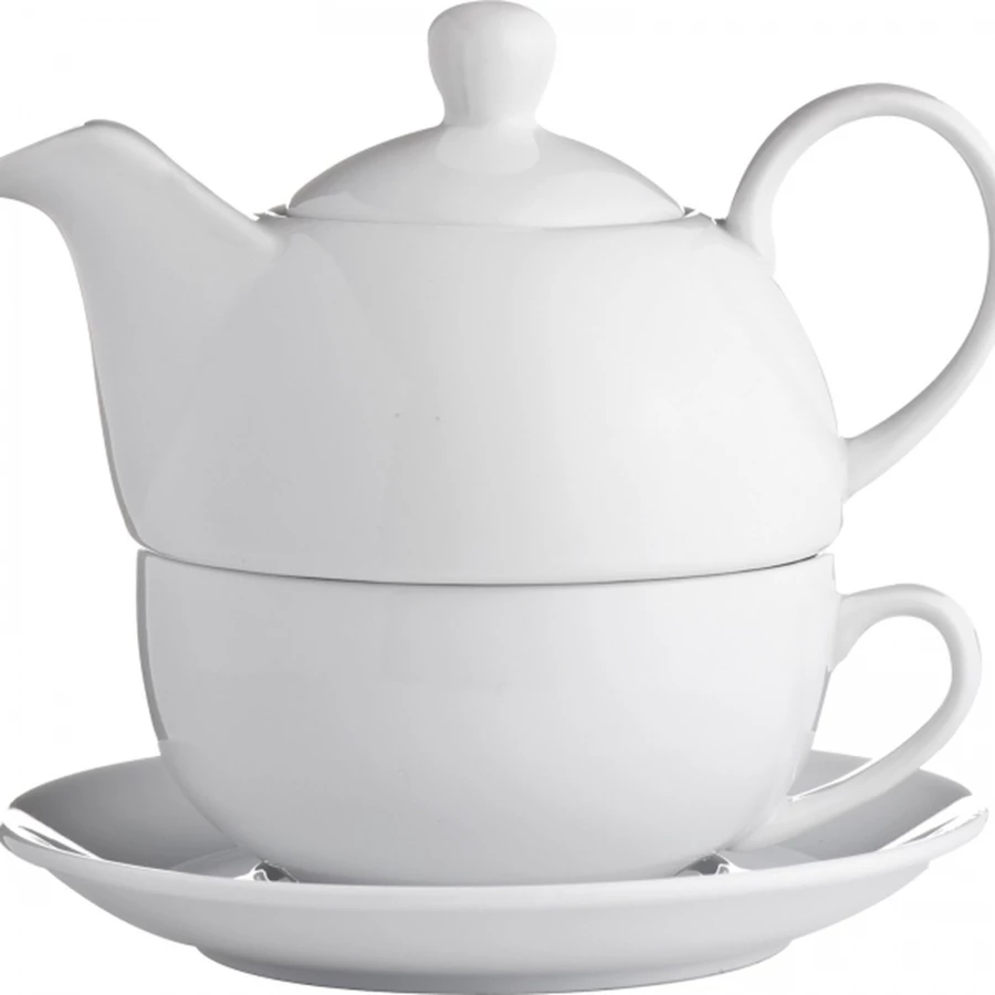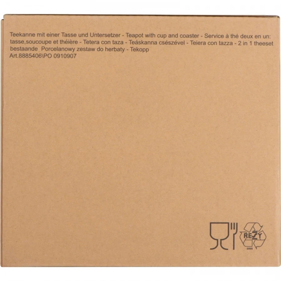 Zestaw do herbaty składający się z czajnika (poj. 400 ml) oraz filiżanki z podstawką (poj. 200 ml). Całość wykonana z porcelany.