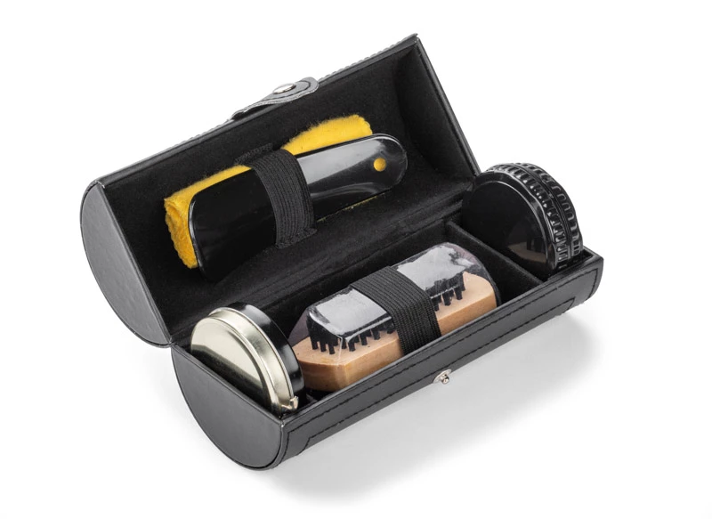 Wszechstronny zestaw do czyszczenia obuwia wykonany z materiału skóropodobnego (PU). Zawiera pastę bezbarwną, czyścik, łyżkę do butów, ściereczkę i szczotkę. Logo umieścimy na tubie.