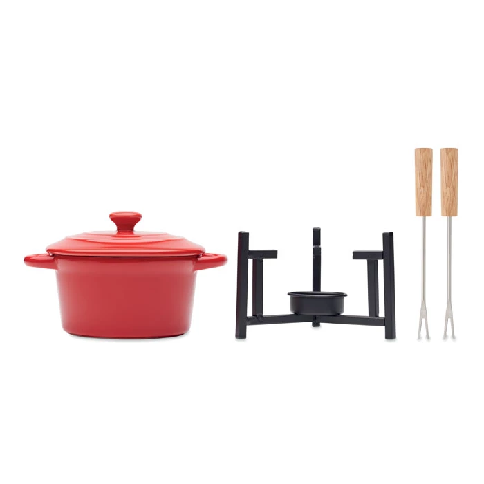 Mały ceramiczny zestaw do fondue dla dwóch osób. Zawiera 2 metalowe widelce z drewnianymi uchwytami. Tealight nie wchodzi w skład zestawu. Pojemność: 300 ml.
