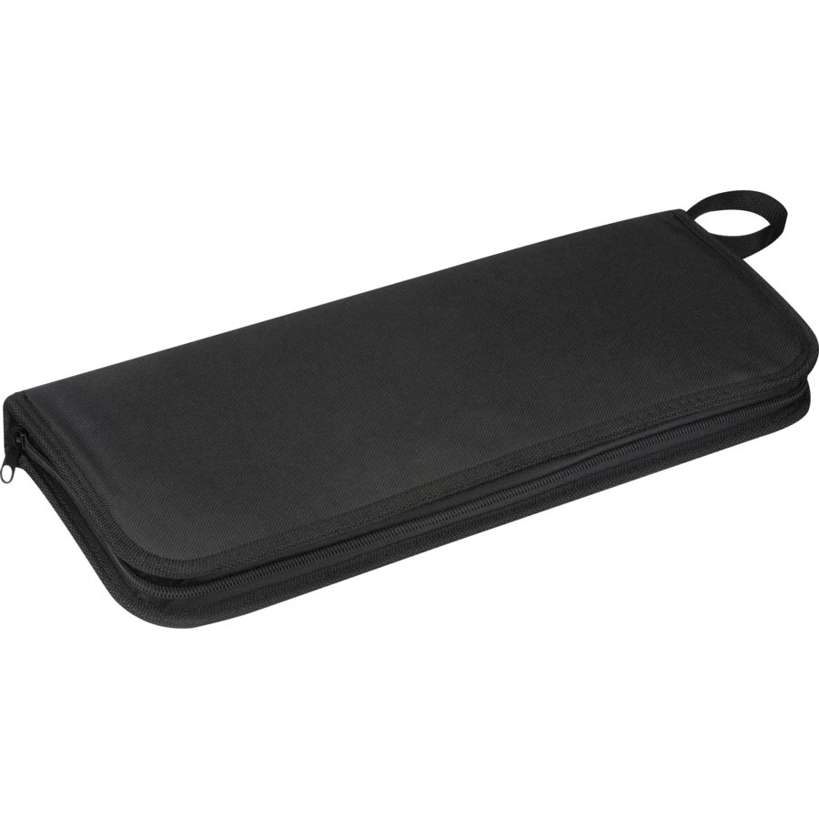 Zestaw do grillowania zapakowany w czarne etui. Zestaw składa się z: noża, łopatki, widelca – wszystko ze stali nierdzewnej oraz bambusowej deski do krojenia.