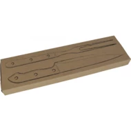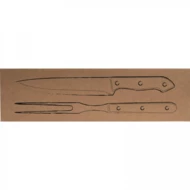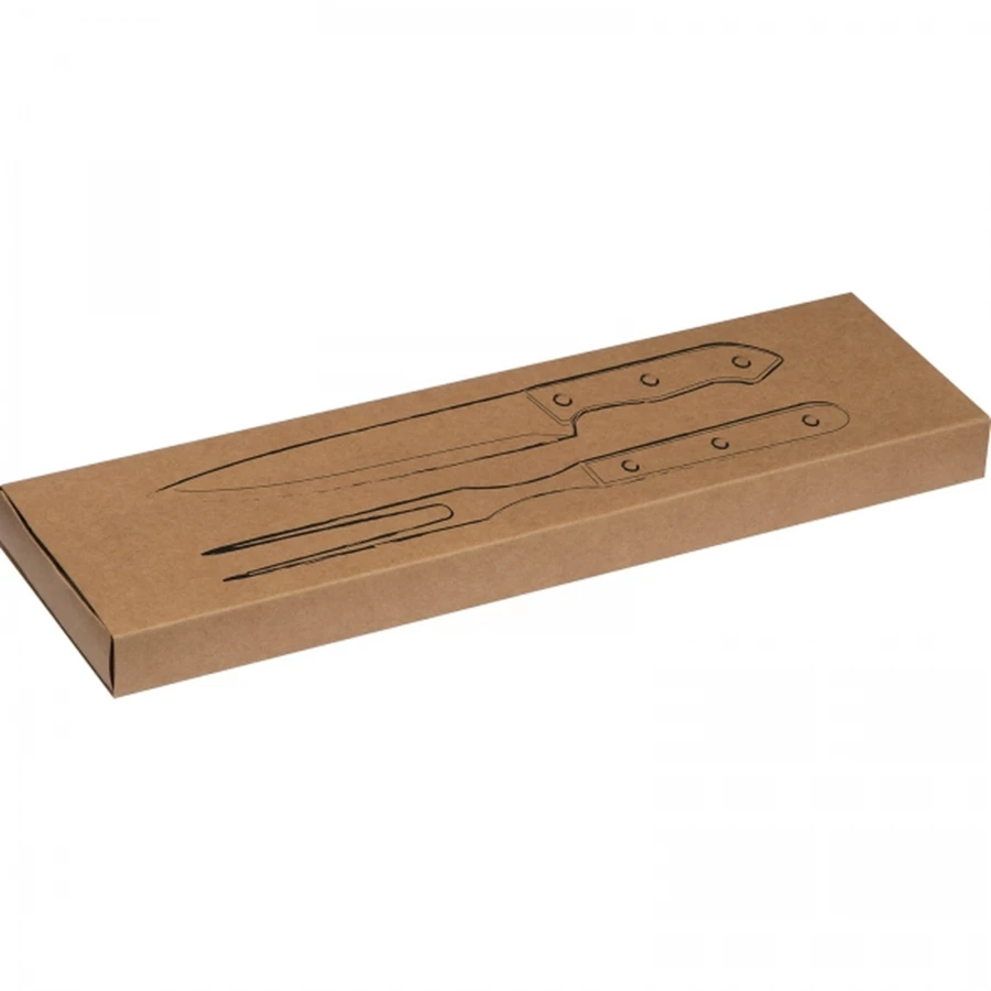 Zestaw sztućców do mięsa, składający się z noża i widelca, wykonane ze stali nierdzewnej z drewnianą rączką. Całość zapakowana w tekturowe opakowanie.