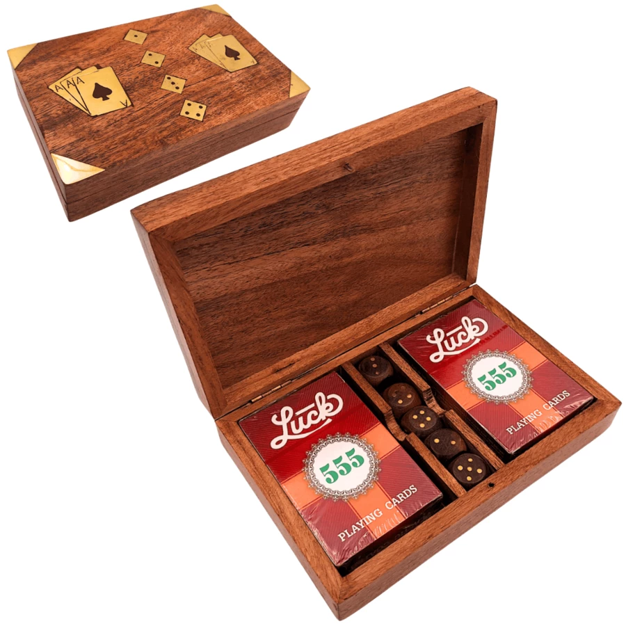 Zestaw do Gry - Dwie Talie Kart i Kości do Gry w Drewnianym Pudełku – Elegancki Prezent dla Gracza – DNU-008