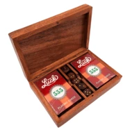 ?Zestaw zawiera: Dwie talie kart do gry, kości do gry, eleganckie drewniane pudełko