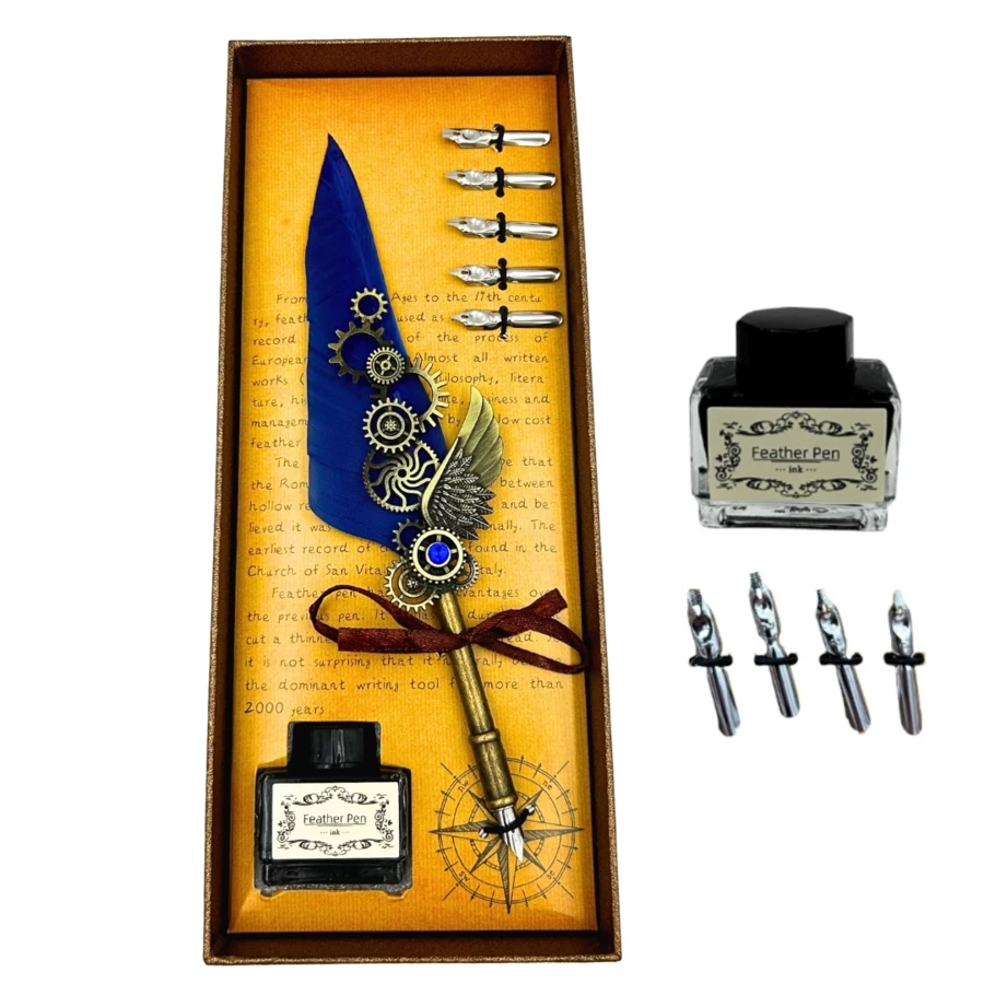 Zestaw do Kaligrafii Retro z Niebieskim Piórem Gęsim Vintage 6 Stalówek Atrament Prezent – EE11 (NMT-323623)