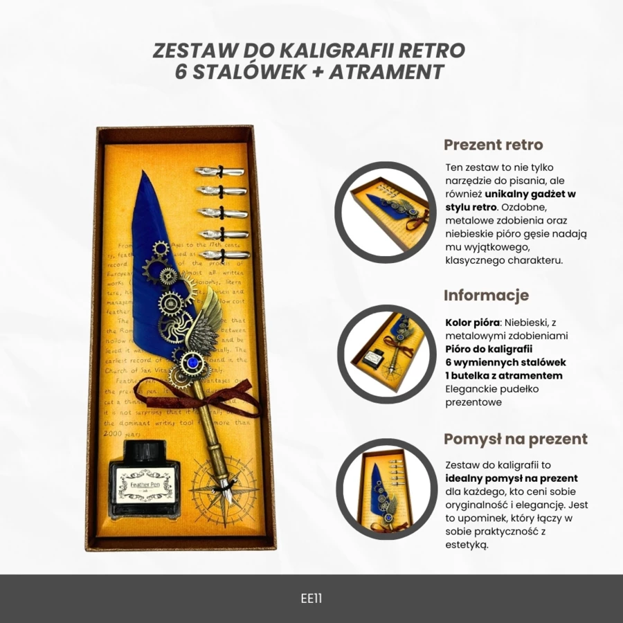 Zestaw do Kaligrafii Retro z Niebieskim Piórem Gęsim Vintage 6 Stalówek Atrament Prezent – EE11