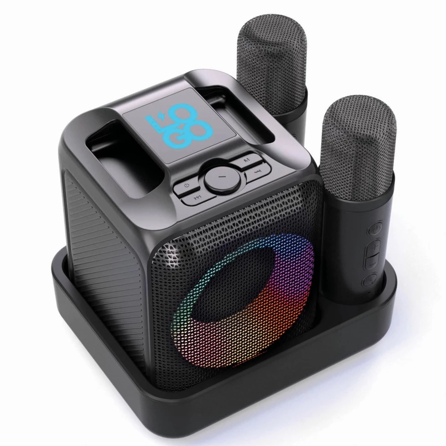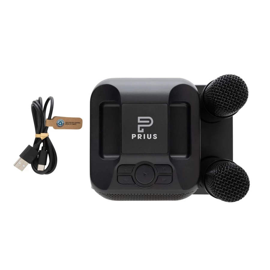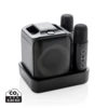 Zestaw do karaoke, głośnik bezprzewodowy 5W, dwa mikrofony, głośnik i mikrofony ładowane bezprzewodowo po umieszczeniu na stacji dokującej, czytnik kart TF/micro SD (nie dołączona), wykonany z ABS z recyklingu, zasięg do 10 m, wbudowany akumulator o pojemności 2000 mAh pozwala na odtwarzanie muzyki do 6 godzin, kabel z TPE z recyklingu w komplecie, całkowita zawartość materiałów z recyklingu obliczona w oparciu o wagę całkowitą przedmiotu: 53%, w pudełku z certyfikatem FSC® mix