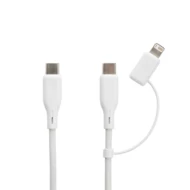 Zestaw do ładowania 2 w 1, ładowarka ścienna USB typu C 20W, kabel 3 w 1 60W, końcówki: 2 x USB C, iOS, wykonane z ABS i TPE z recyklingu, wyjście ładowarki 5V/3A, 9V/2.22A, 12V/1.67A, 20W, całkowita zawartość materiałów z recyklingu obliczona w oparciu o wagę całkowitą przedmiotu: 59%, w pudełku z certyfikatem FSC®