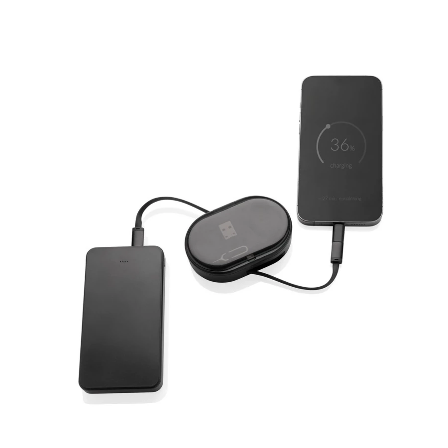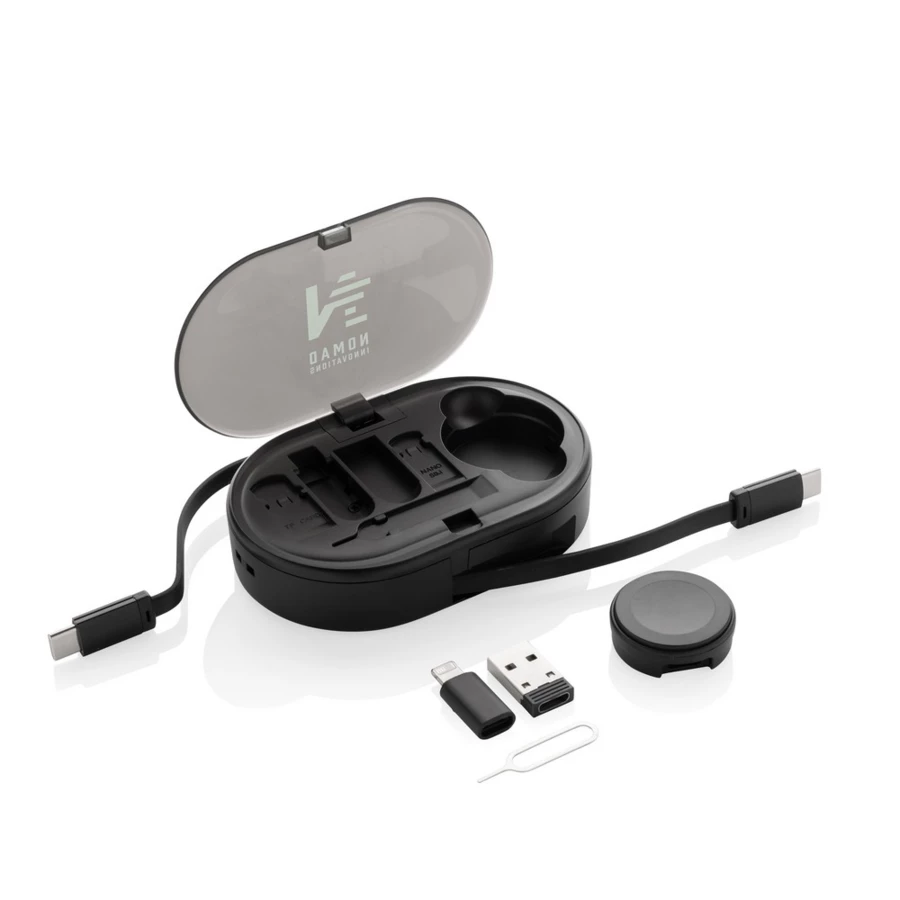 Zestaw do ładowania, zwijany kabel do ładowania, ładowarka bezprzewodowa do zegarka, dodatkowe końcówki w komplecie, wykonany z materiałów pochodzących z recyklingu, całkowita zawartość materiałów z recyklingu obliczona na podstawie masy całkowitej produktu: 51%