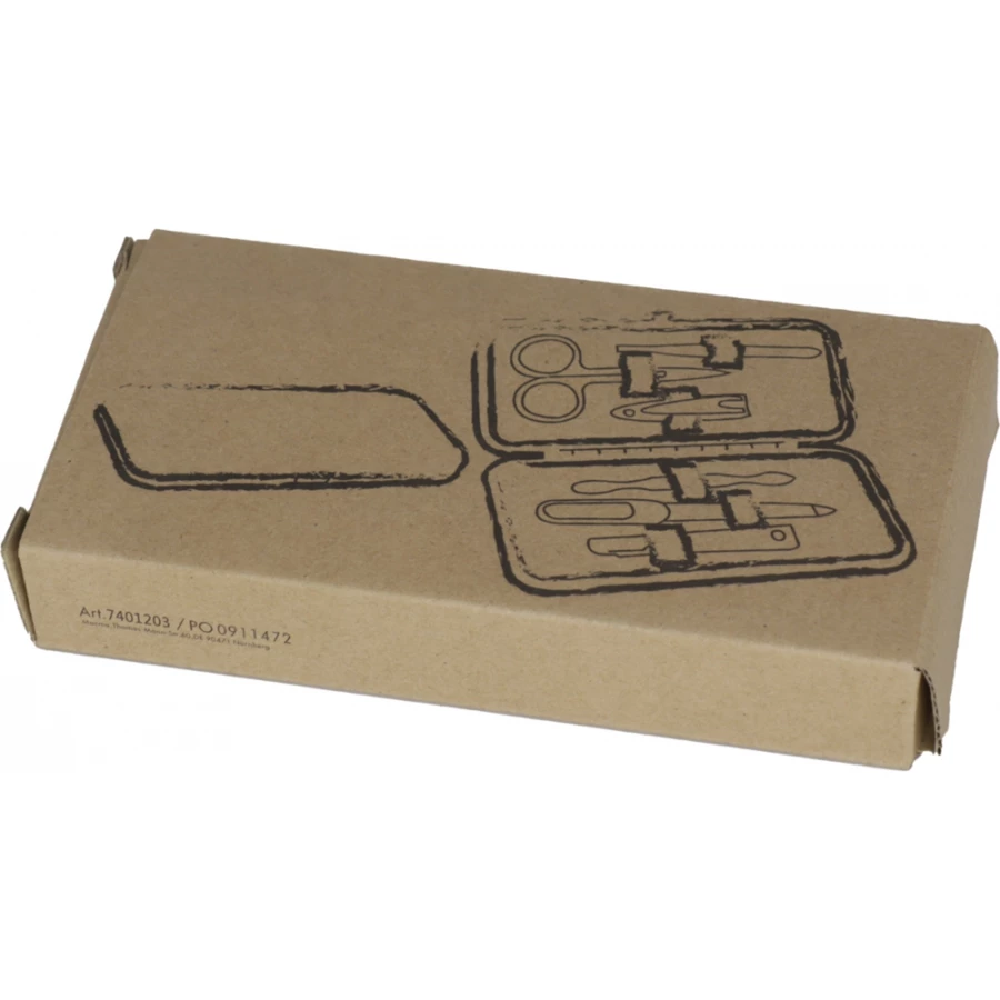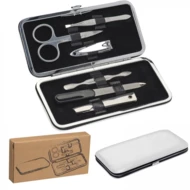 Zestaw do manicure, składający się z nożyczek, cążków, pęsety, diamentowego pilnika oraz przyrządu do usuwania skórek i czyszczenia paznokci. Etui z PU, wyposażenie ze stali nierdzewnej.