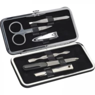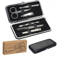 Zestaw do manicure, składający się z nożyczek, cążków, pęsety, diamentowego pilnika oraz przyrządu do usuwania skórek i czyszczenia paznokci. Etui z PU, wyposażenie ze stali nierdzewnej.