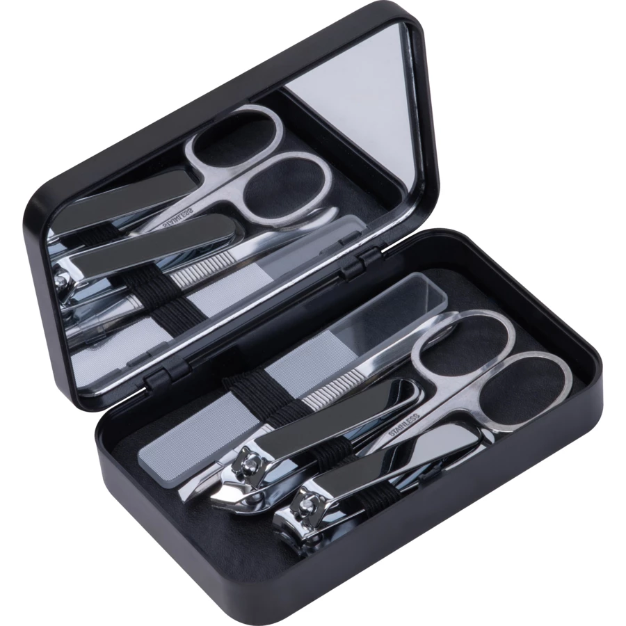 Kompaktowy, 5 częściowy zestaw do manicure w etui z wbudowanym lusterkiem.