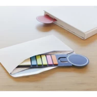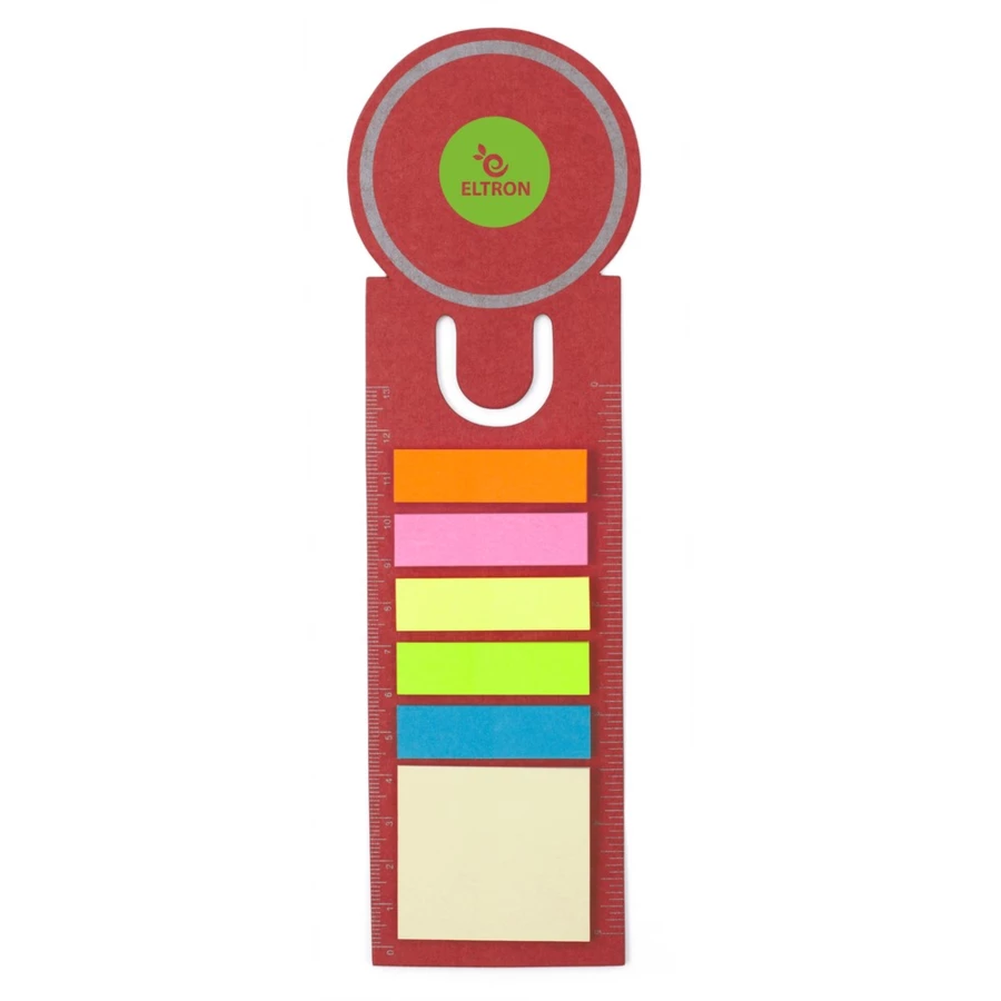 Zestaw do notatek z nadrukowaną linijką 13 cm / 5 cali i zakładka do książki w jednym, dzięki dedykowanemu miejscu pod znakowanie logotyp lub hasło reklamowe może pozostać widoczne nawet po włożeniu do książki, w komplecie znajdują się także małe karteczki samoprzylepne w 5 kolorach oraz notes 4 x 4,5 cm, produkt wykonany z kartonu i papieru
