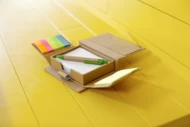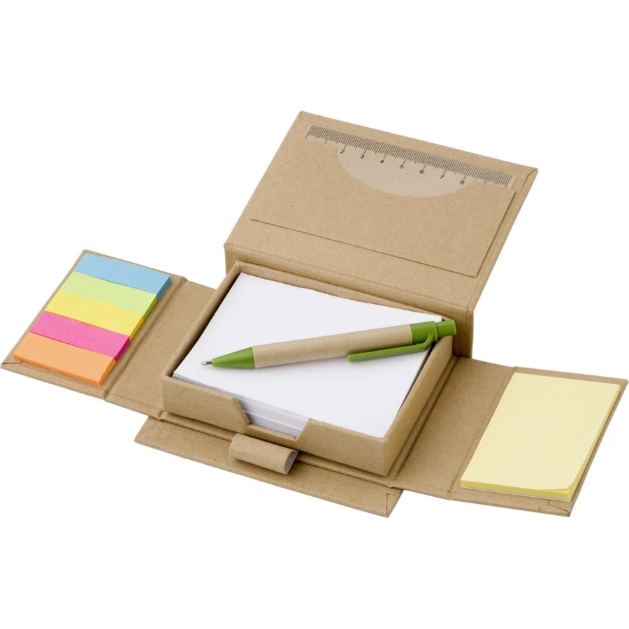 Zestaw do notatek, 150 karteczek samoprzylepnych, 160 pustych kartek oraz długopis w etui, linijka na pokrywce i kieszonka na wizytówki