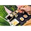 Efektowny zestaw do sushi. Składa się z dużej kamiennej deski, bambusowych pałeczek, porcelanowych podstawek, bambusowej maty oraz dwóch miseczek na sos. Doskonały prezent dla miłośników sushi.