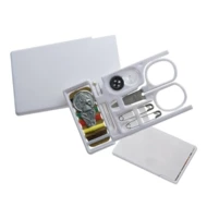 Podróżny zestaw krawiecki LE HAVRE. W zestawie: nożyczki, igły, nici, agrafki, nawlekarka do nici i zapasowe guziki. Całość zamknięta w pudełku w kształcie karty kredytowej.