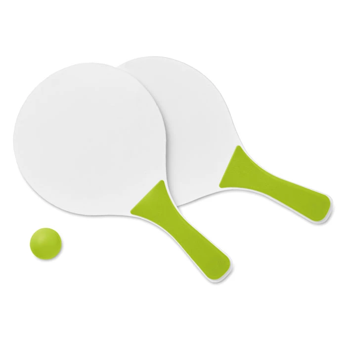 Mały zestaw do gry na plaży. Zawiera 2 paletki wykonane z MDF i jedną miękką piłeczkę.