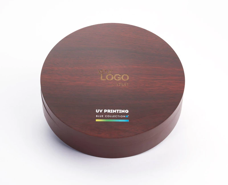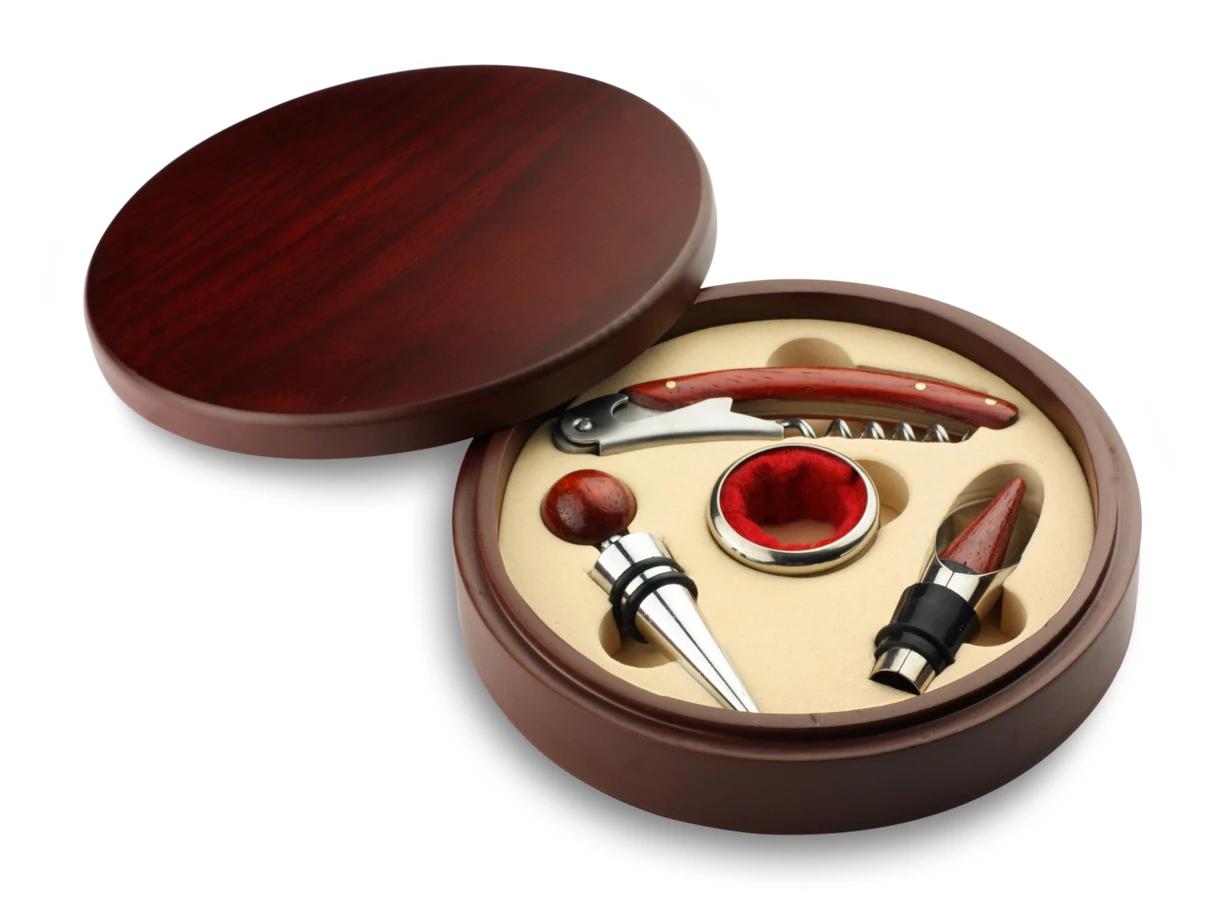 Praktyczny czteroelementowy komplet do wina w okrągłej drewnianej skrzyneczce. Zestaw zawiera nóż kelnerski, dwie zatyczki ozdobione korkiem oraz opaskę na butelkę. Logo grawerujemy bezpośrednio na pudełku.