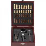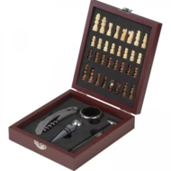 Zestaw do wina w drewnianym pudełku z dołączonymi drewnianymi szachami. W pudełku znajdują się: nóż kelnerski, korek, termometr i ociekacz.