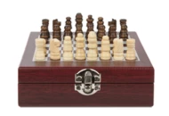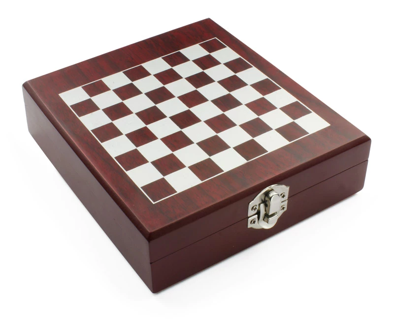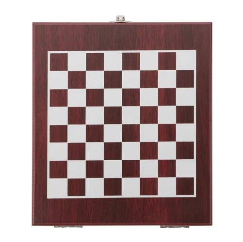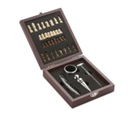 Komplet do wina zawierający 4 elementy: nóż kelnerski, termometr, zatyczkę oraz opaskę na szyjkę butelki. Dodatkowo posiada komplet szachów. Szachy wykonane są z drewna. Logo grawerujemy na pudełku.