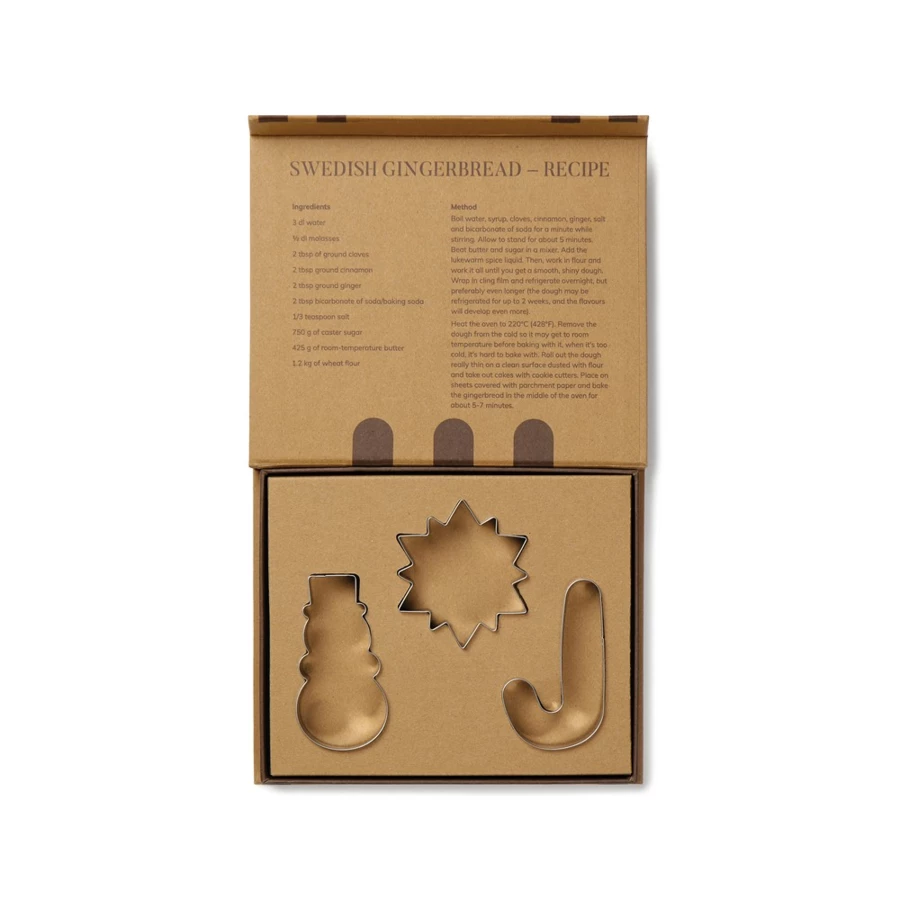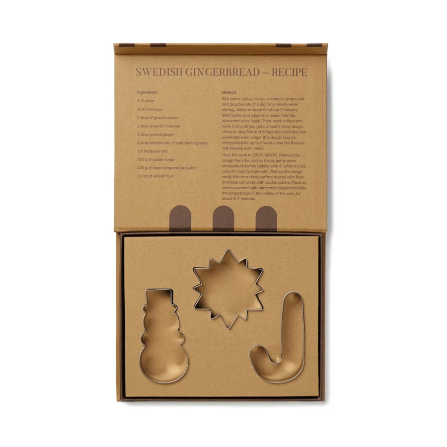 Zestaw foremek do ciastek, 3 różne kształty, wykonane ze stali nierdzewnej, łatwe w czyszczeniu, w pudełku upominkowym, wewnątrz pudełka przepis na szwedzkie ciasteczka imbirowe