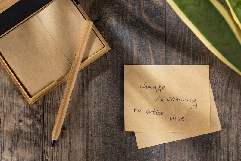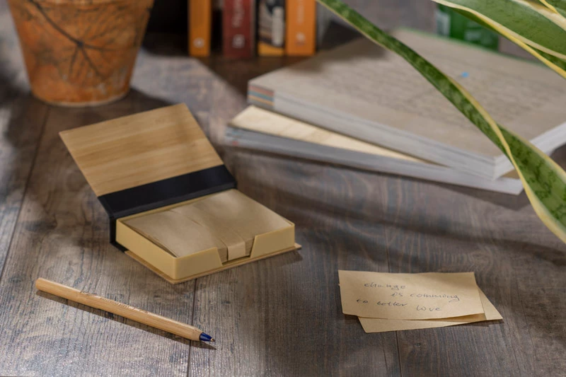 Zestaw karteczek na biurko zapakowany w etui wykonane z bambusa. W zestawie znajdują się brązowe karteczki do zapisków.