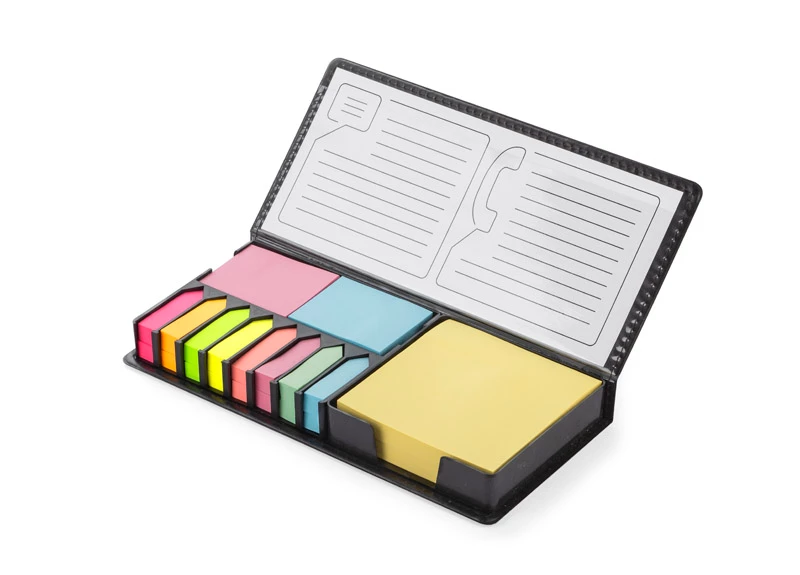 Zestaw karteczek samoprzylepnych pakowanych w czarne etui. Zestaw zawiera 1 bloczek dużych karteczek, 2 bloczki średnich karteczek i 8 małych bloczków zakładek indeksowych w różnych kolorach. Pudełko posiada miejsca na każdy z zestawów karteczek, dzięki czemu te się nie mieszają. W etui umieszczona jest kartka z miejscem na notatki. Logo grawerujemy na metalowej blaszce, którą można umieścić na wierzchu etui. Blaszka jest dołączona osobno.