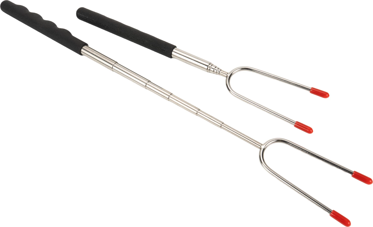 Praktyczny zestaw dwóch teleskpowych kijków do pieczenia kiełbasy, idealny na ognisko. Zapakowane w nylonowy pokrowiec ze ściągaczem - 29 x 10 x 1 cm. Materiał: stal nierdzewna, rękojeść PVC.