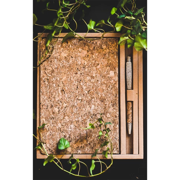Zestaw korkowy składający się z notesu o wymiarach: 14 x 21cm (gramatura 1250 g), 80 kartek w linie 70 g/m2 oraz korkowego długopisu. Pakowany w kartonowe pudełko.