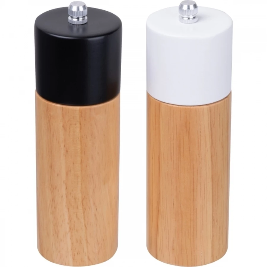 Zestaw młynków do soli i pieprzu wykonany z drewna z ceramicznymi mechanizmami mielenia.