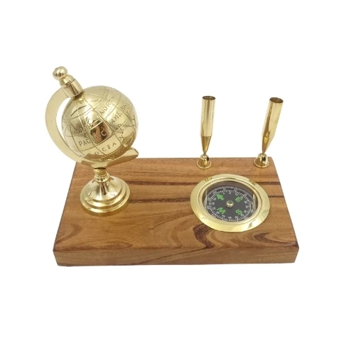Globusik, uchwyty na długopisy oraz obudowa kompasu wykonane z mosiądzu.