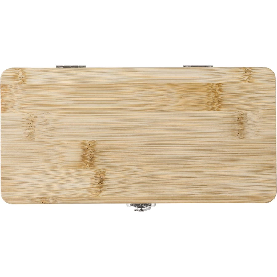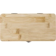 Zestaw narzędzi ze stali węglowej, 20 el., w zestawie: 3 śrubokręty, 10 bitów z uchwytami, adapter, 4 klucze nasadowe, nóż, uchwyt, złącze, w bambusowym pudełku zamykanym na klip