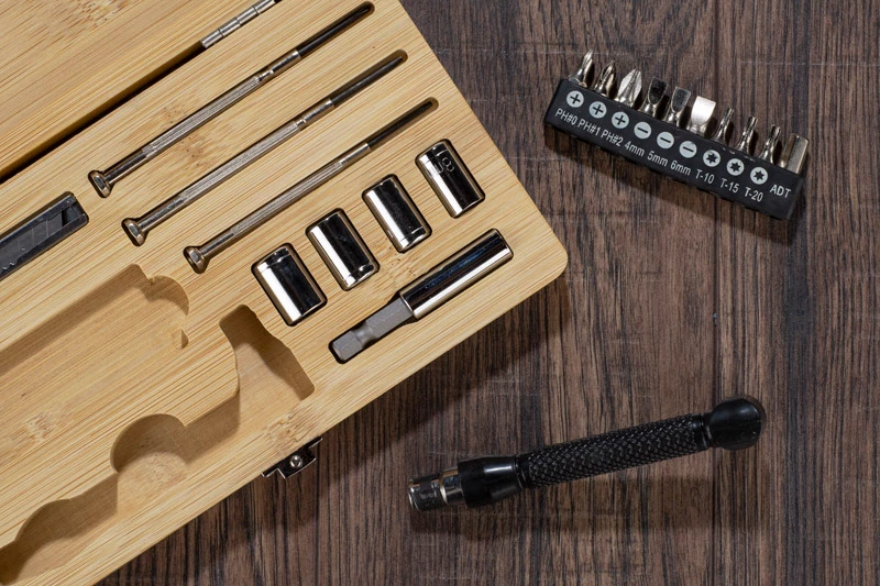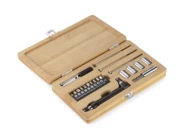 MAD to zestaw narzędzi w bambusowej obudowie. Zestaw zawiera: wkrętak, dziesięć różnych bitów, przedłużkę, cztery nasadki (7 mm, 8 mm, 9 mm i 10 mm), trzy wkrętaki precyzyjne oraz nożyk do tapet. Obudowa zamykana na metalowy zatrzask.