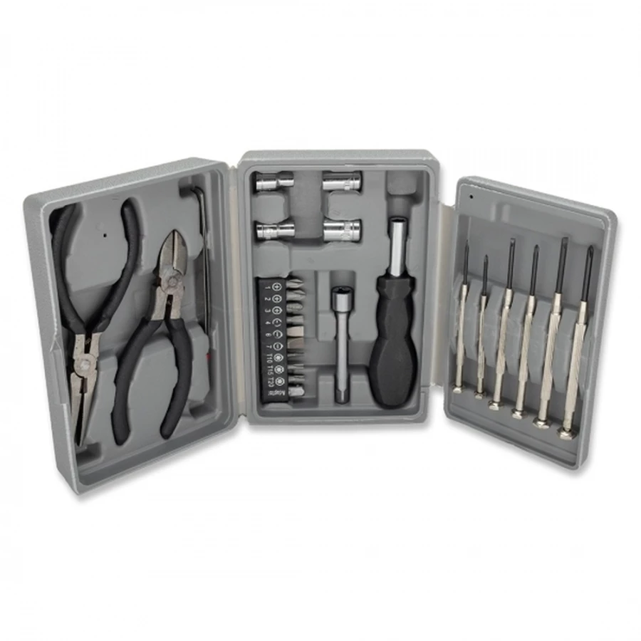 Zestaw stalowych narzędzi 25-częściowy MANAGUA. W zestawie znajdują się: m.in. śrubokręt i inne małe, precyzyjne narzędzia.
